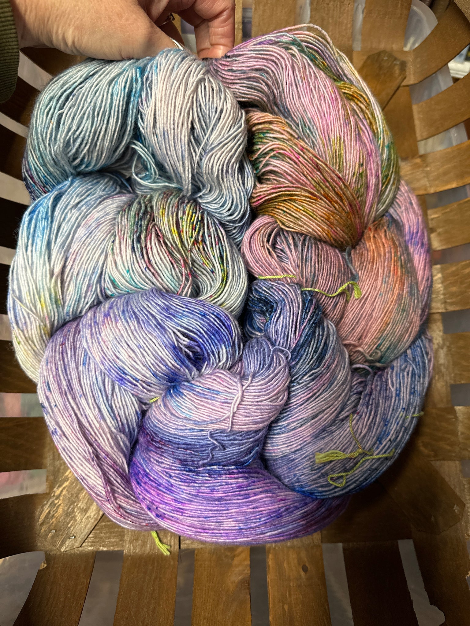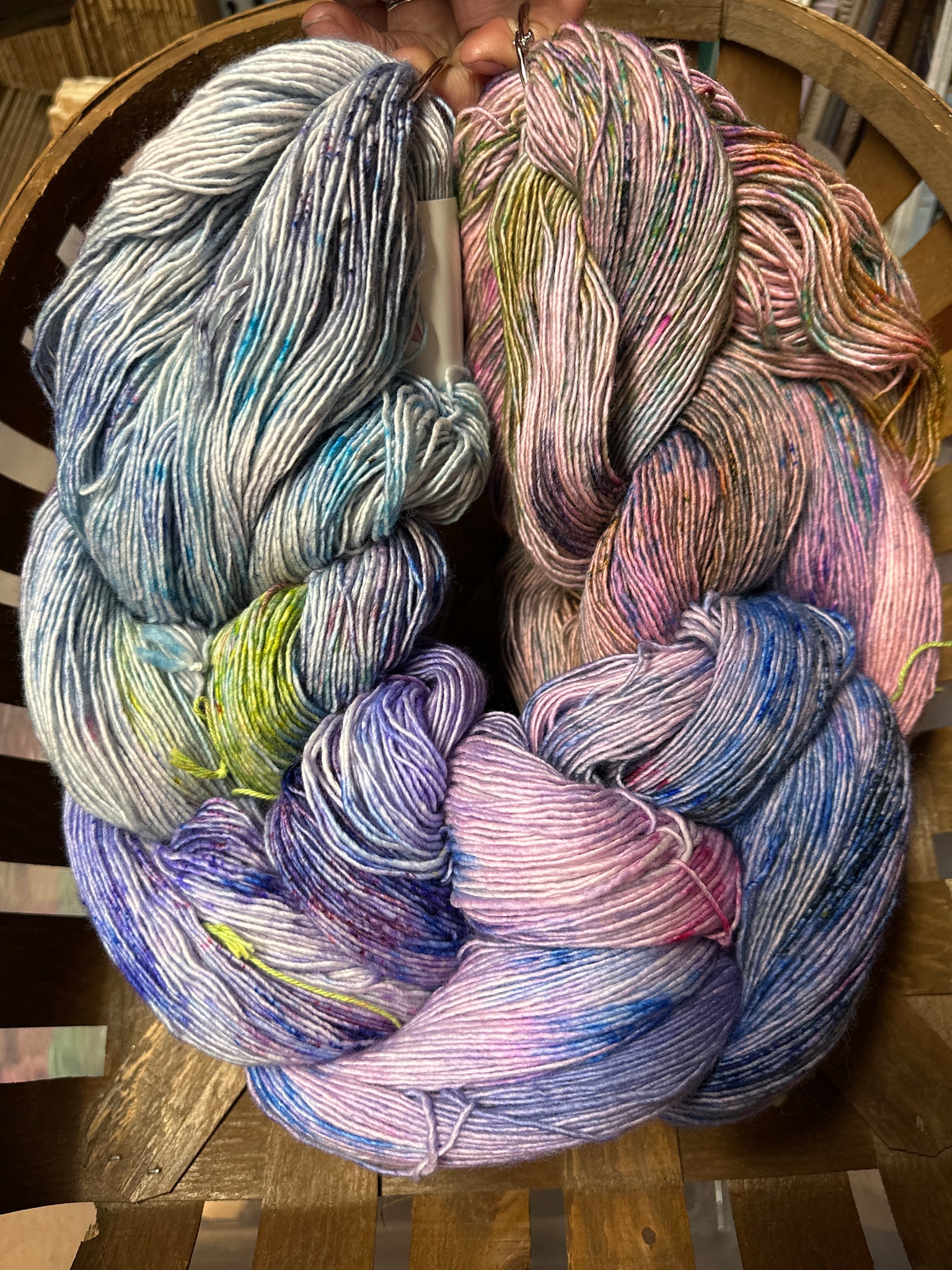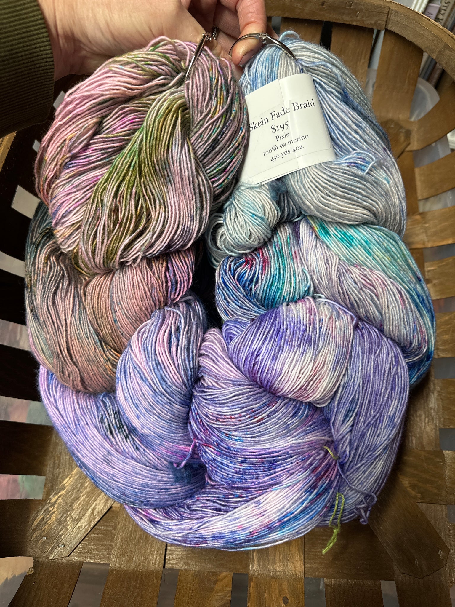 Base yarn: Pixie Single Ply: 100% sw merino; 430 yds/4oz.