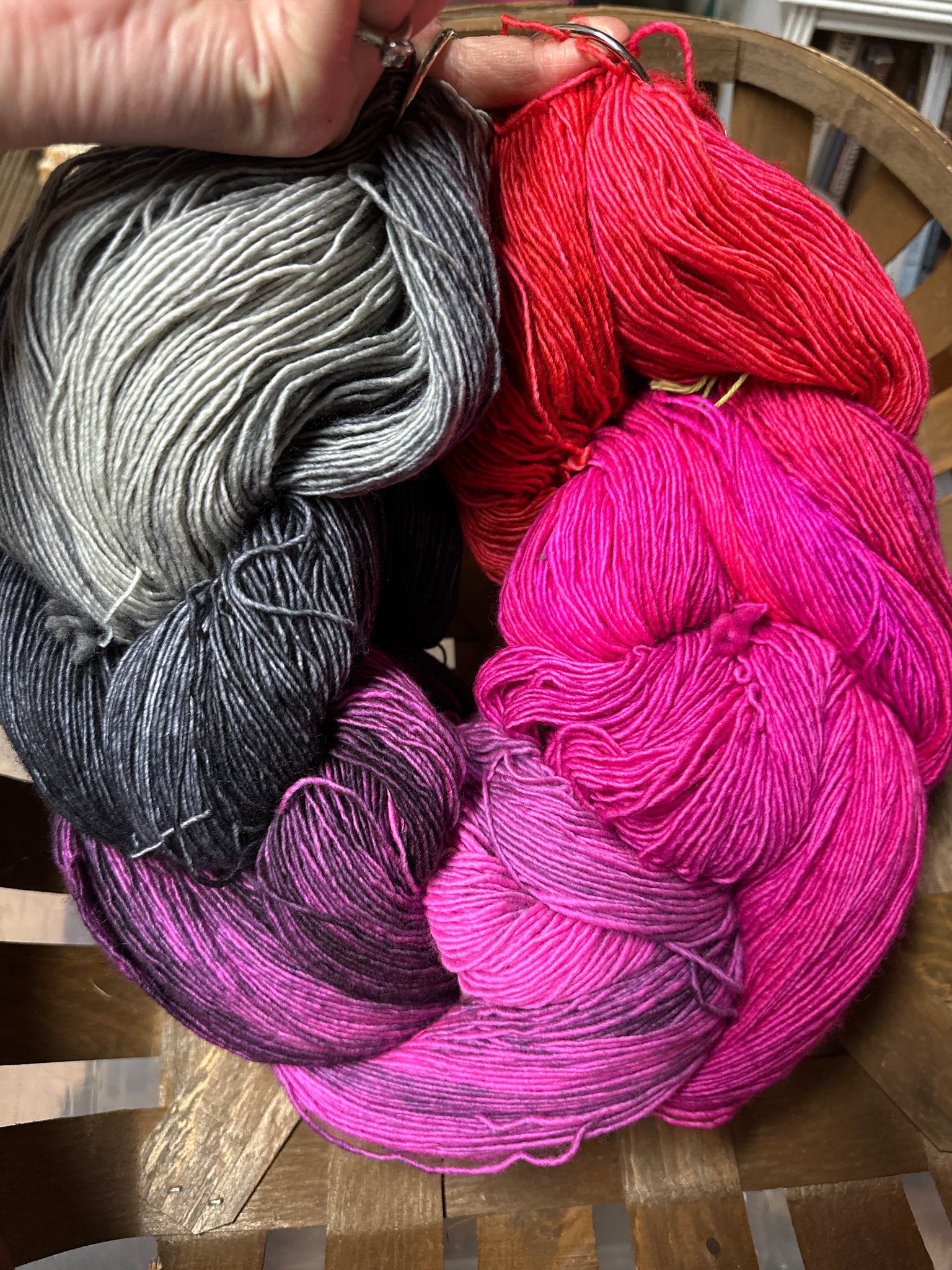 Base yarn: Pixie Single Ply: 100% sw merino; 430 yds/4oz.