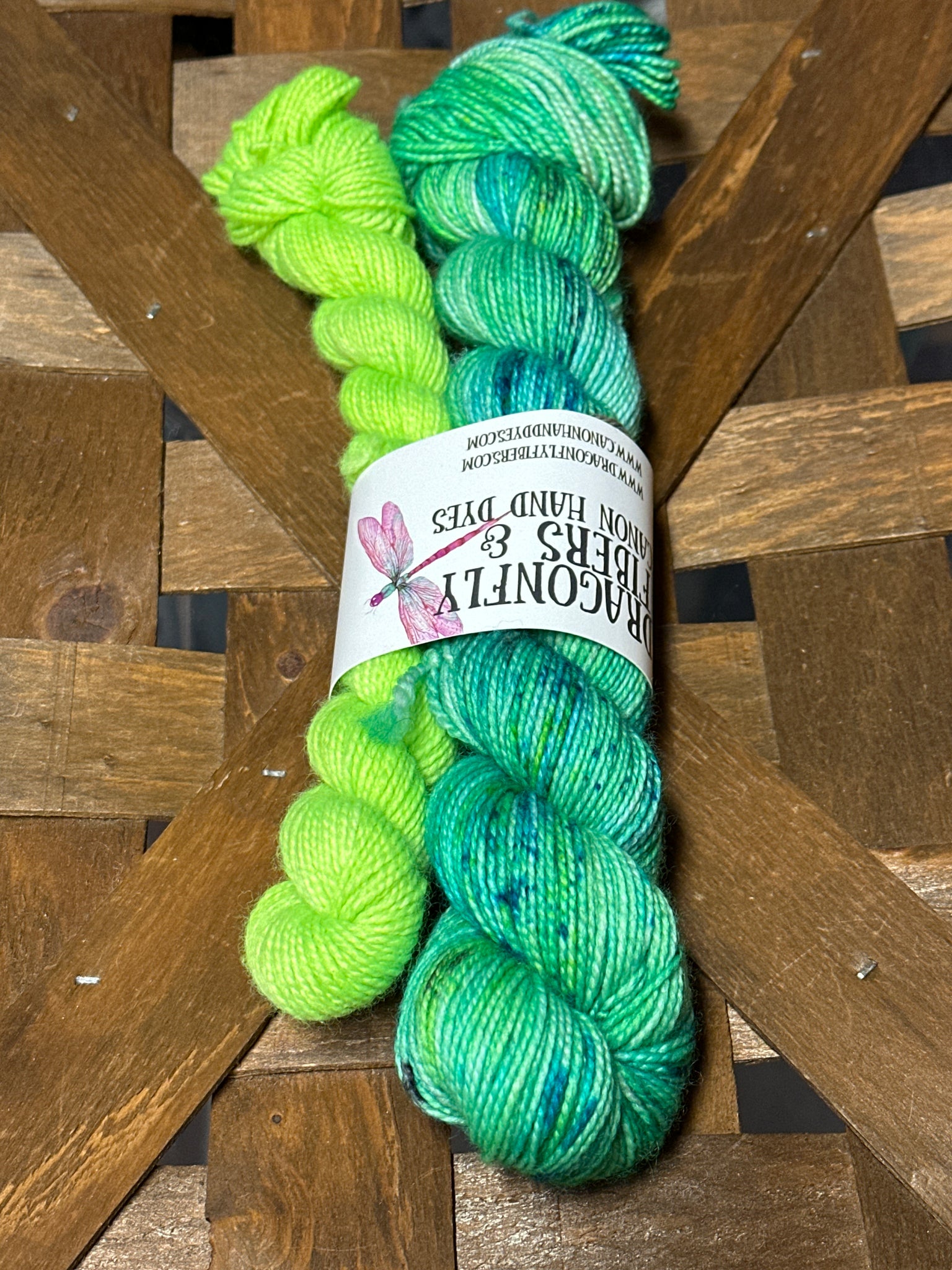 Sets are one 50g skein (200 yds) of fingering weight yarn plus one 20g contrast mini (80 yds) on the same base as the 50g skein