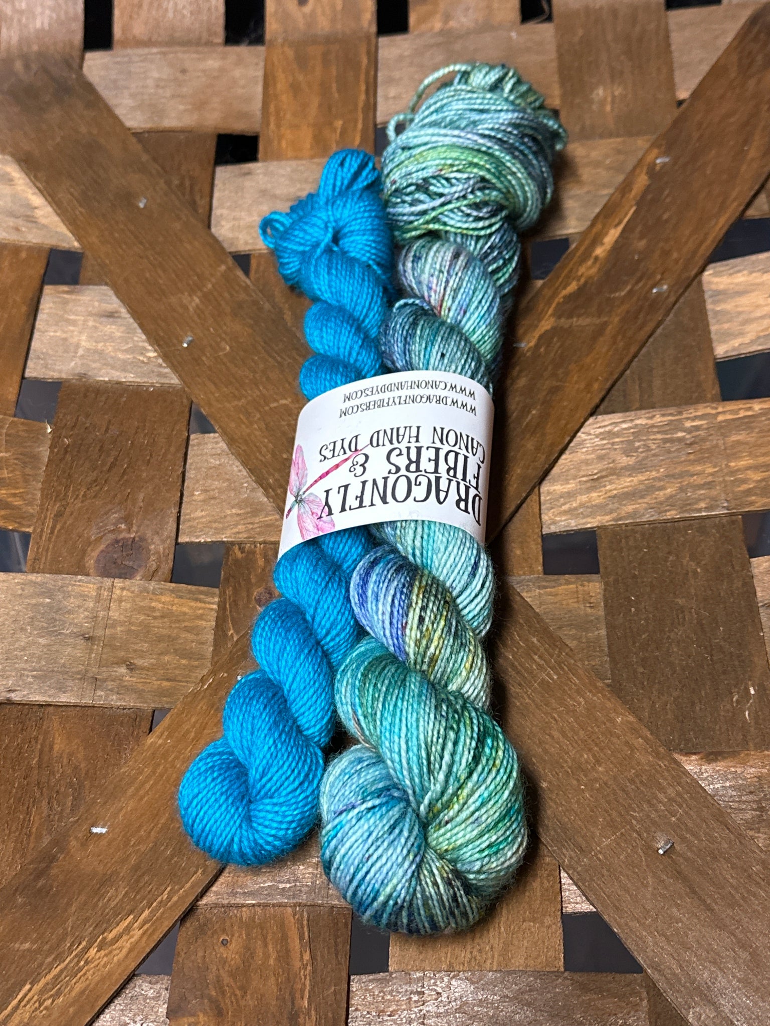 Sets are one 50g skein (200 yds) of fingering weight yarn plus one 20g contrast mini (80 yds) on the same base as the 50g skein