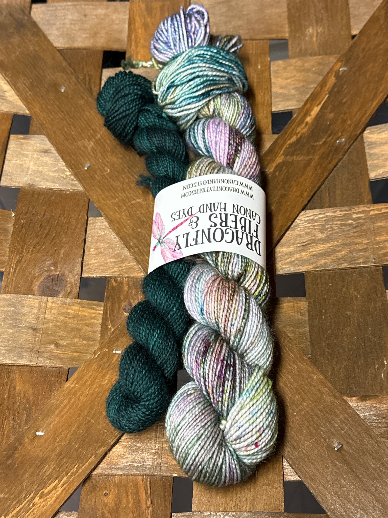 Sets are one 50g skein (200 yds) of fingering weight yarn plus one 20g contrast mini (80 yds) on the same base as the 50g skein
