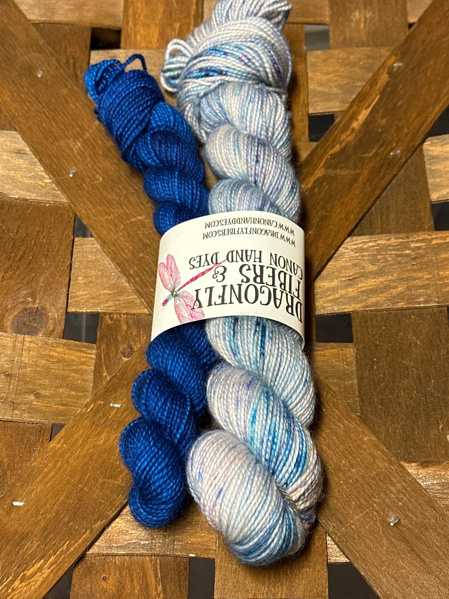 Sets are one 50g skein (200 yds) of fingering weight yarn plus one 20g contrast mini (80 yds) on the same base as the 50g skein