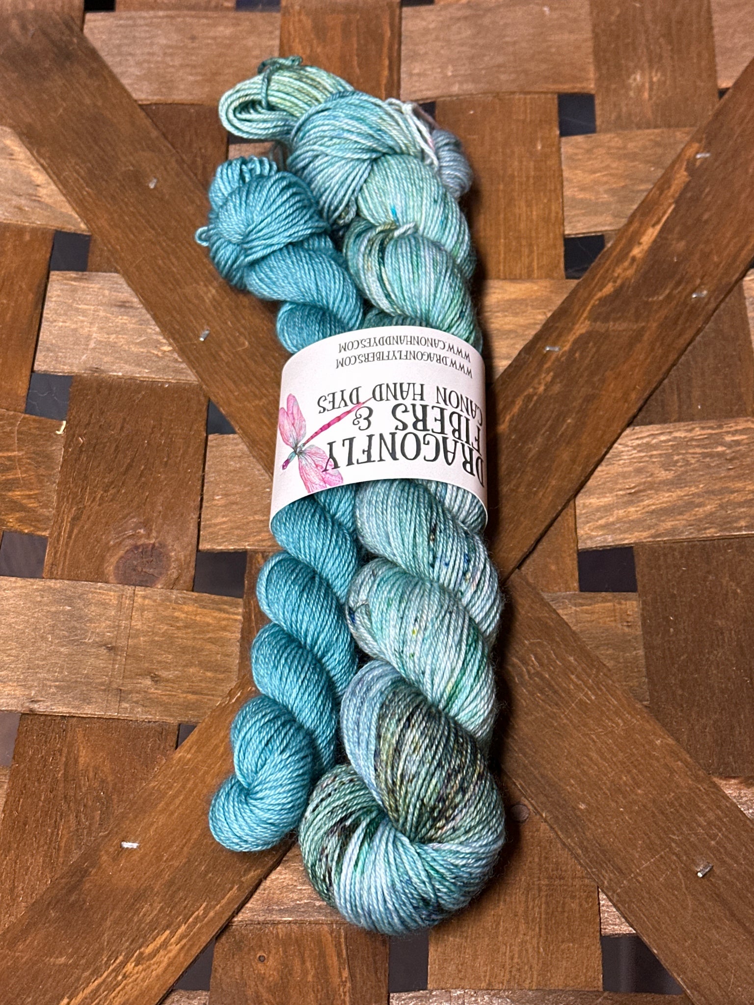 Sets are one 50g skein (230 yds) of fingering weight yarn plus one 20g contrast mini (93 yds) on the same base as the 50g skein