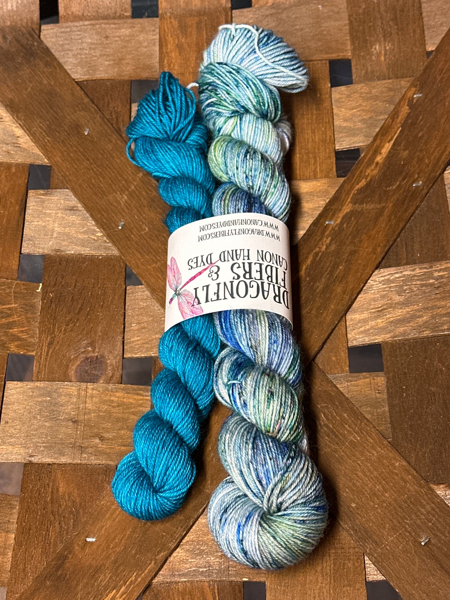 Sets are one 50g skein (230 yds) of fingering weight yarn plus one 20g contrast mini (93 yds) on the same base as the 50g skein