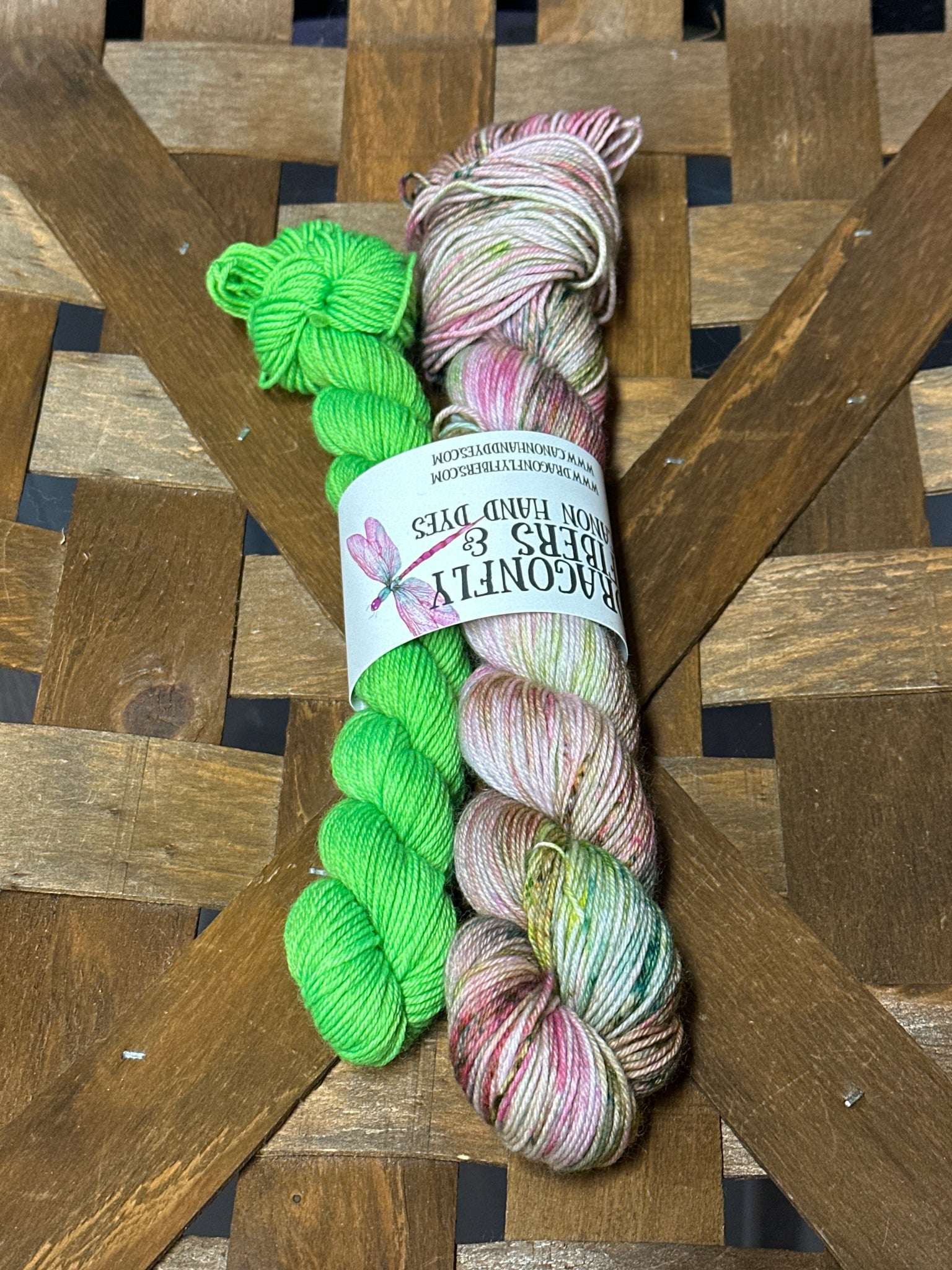 Sets are one 50g skein (230 yds) of fingering weight yarn plus one 20g contrast mini (93 yds) on the same base as the 50g skein