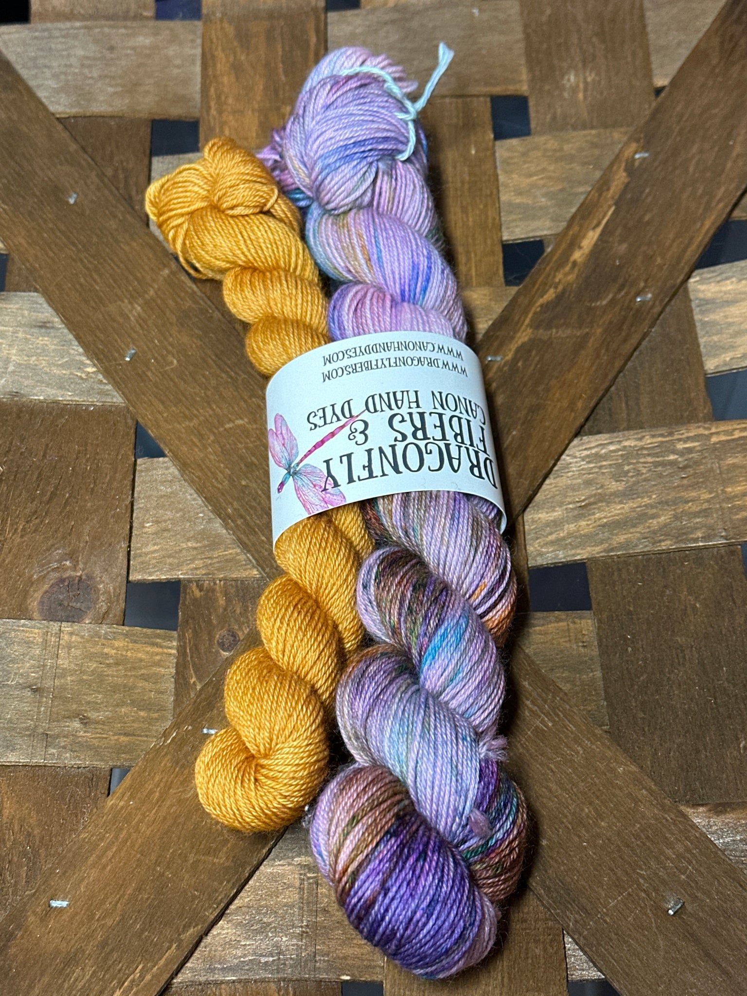 Sets are one 50g skein (230 yds) of fingering weight yarn plus one 20g contrast mini (93 yds) on the same base as the 50g skein